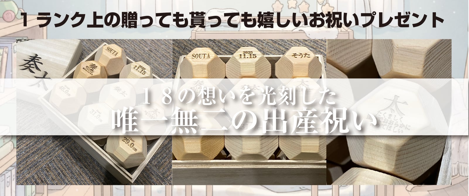■商品名/ 18面体脳トレ積み木ブロック OHAKO [オハコ] ※出産祝い用 18個にお子さんへの想いを刻印バージョン ※大阪製ブランド2025年度認定商品 ―――――――――――――――――――――― ■商品内容/積み木:18個 収納用箱:1箱 ■素 材/積み木:ヒノキ(産地:関西) 収納用箱:桐 ■納期/ご注文からおよそ3営業日以内で発送(土日祝除く) ※受注生産のため、少々お時間をいただく場合がございます。 ■刻印内容/通常脳トレ積み木OHAKOのロゴ刻印 ■刻印オーダーについて下記にまとめております ■配送方法:佐川急便 (基本送料無料/沖縄・北海道・離島は除く) ■製造者:株式会社花岡工務店(大阪府摂津市新在家2-1-19) ―――――――――――――――――――――― ■刻印オーダーについて (最大1行5文字で3行まで刻印ができます) 18個それぞれに出産時の想いで積み木に刻むことができます。下記はその一例です。 ①お子様の名前 漢字 ②お子様の名前 ローマ字 ③お子様の名前 ひらがな ④お子様の生まれた日 ⑤お子様の生まれた時間 ⑥お子様の誕生年 ⑦お子様の生まれた時の体重 ⑧お子様の生まれた時の頭の大きさ ⑨お子様の生まれた時の胸囲 ⑩お子様の生まれた時の身長 ⑪お子様の名前の由来 一文字ずつ ⑫お子様の星座 ⑬お子様の十二支 ⑭お子様のラッキーカラー ⑮お子様の性別 ⑯お子様のラッキーフラワー ⑰パパママの名前 ⑱生まれた病院の名前 そのほかご希望があれば要望に合わせて刻印いたします。 例えば生まれた産婦人科の名前、出生地など ――――――――――――――――― ◆ 積んで、組んで、転がして、しまって。 子どもからおじいちゃんおばあちゃんまで、 家族みんなが夢中になれる「遊び」と「学び」の積み木です。 ひとつひとつの積み木に刻印を施した18個の多面体ヒノキ積み木。 積み上げたり、転がしたり、自由に発想して遊びながら、自然と脳を刺激する設計になっています。 ワクワクしながら箱を開ける瞬間も楽しさのひとつです。 ◆ 大工さんたちの手仕事から生まれました 私たちは、大阪・摂津市にある創業20年の工務店「花岡工務店」です。 普段は木造住宅のリフォームやオーダーサウナの製作、エアコン洗浄などを行っています。 この積み木は、現場帰りの大工たちが、 **“子どもも大人もワクワクするものを”**と想いを込めて、 一つひとつ丁寧に手づくりしています。 ―――――――――――――――――― ◆名前の由来は「十八番(オハコ)」 積み木18個が桐箱に入れてお届けする国産積み木です。 18面体の積み木が18個箱に入っている品だからこそ、 私たちの“十八番=OHAKO”と名付けました。 ――――――――――――――――――