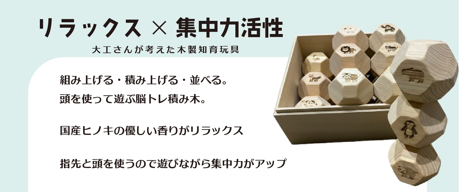■商品名/ 18面体脳トレ積み木ブロック OHAKO [オハコ] ※刻印タイプ|動物イラスト刻印 ※2025年度大阪製ブランド認定商品 ※子どもPSCマーク取得 ―――――――――――――――――――――― ■商品内容/積み木:18個 収納用箱:1箱 ■素 材/積み木:ヒノキ(産地:関西) 収納用箱:桐 ■納期/ご注文からおよそ3営業日以内で発送(土日祝除く) ※受注生産のため、少々お時間をいただく場合がございます。 ■刻印内容/通常脳トレ積み木OHAKOのロゴ刻印 ◆動物イラスト例(全24種から18種ランダム) ゴリラ・キツネ・イヌ・ライオン・サル・ブタ・トラ・チーター・キリン・ゾウ・アライグマ・ウシ・カンガルー・カバ・ウマ・シマウマ・ウサギ・コアラ・ニワトリ・タヌキ・カピバラ・ハリネズミ・シカ・パンダ・シロクマなど ※「この動物だけは絶対入れて!」というご希望がある場合は、ご注文時にお知らせください。 ■配送方法:佐川急便 (基本送料無料/沖縄・北海道・離島は除く) ■製造者:株式会社花岡工務店(大阪府摂津市新在家2-1-19) ―――――――――――――――――――――― ◆ 積んで、組んで、転がして、しまって。 子どもからおじいちゃんおばあちゃんまで、 家族みんなが夢中になれる「遊び」と「学び」の積み木です。 ひとつひとつの積み木に刻印を施した18個の多面体ヒノキ積み木。 積み上げたり、転がしたり、自由に発想して遊びながら、自然と脳を刺激する設計になっています。 ワクワクしながら箱を開ける瞬間も楽しさのひとつです。 ◆ 大工さんたちの手仕事から生まれました 私たちは、大阪・摂津市にある創業20年の工務店「花岡工務店」です。 普段は木造住宅のリフォームやオーダーサウナの製作、エアコン洗浄などを行っています。 この積み木は、現場帰りの大工たちが、 **“子どもも大人もワクワクするものを”**と想いを込めて、 一つひとつ丁寧に手づくりしています。 ―――――――――――――――――― ◆名前の由来は「十八番(オハコ)」 積み木18個が桐箱に入れてお届けする国産積み木です。 18面体の積み木が18個箱に入っている品だからこそ、 私たちの“十八番=OHAKO”と名付けました。 ―――――――――――――――――― ◆インスタグラムでも紹介中! 最新情報や制作風景はこちらから ◆ https://www.instagram.com/hanakou8702/ 遊びながら脳が育つ。 大工の手から生まれた、家族のための積み木。 ご自宅用にも、出産祝いやお誕生日のギフトにもおすすめです。