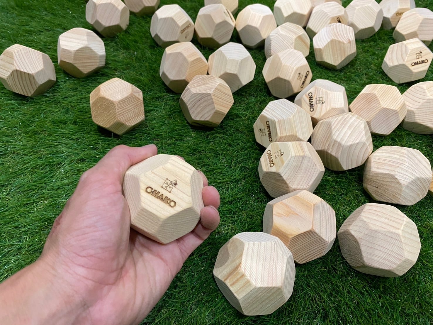 18面からなる多面体国産積み木です。大工さんが手作業で作った積み木です。18面の積み木なので“十八番にちなんでOHAKO(オハコ)と名付けました。