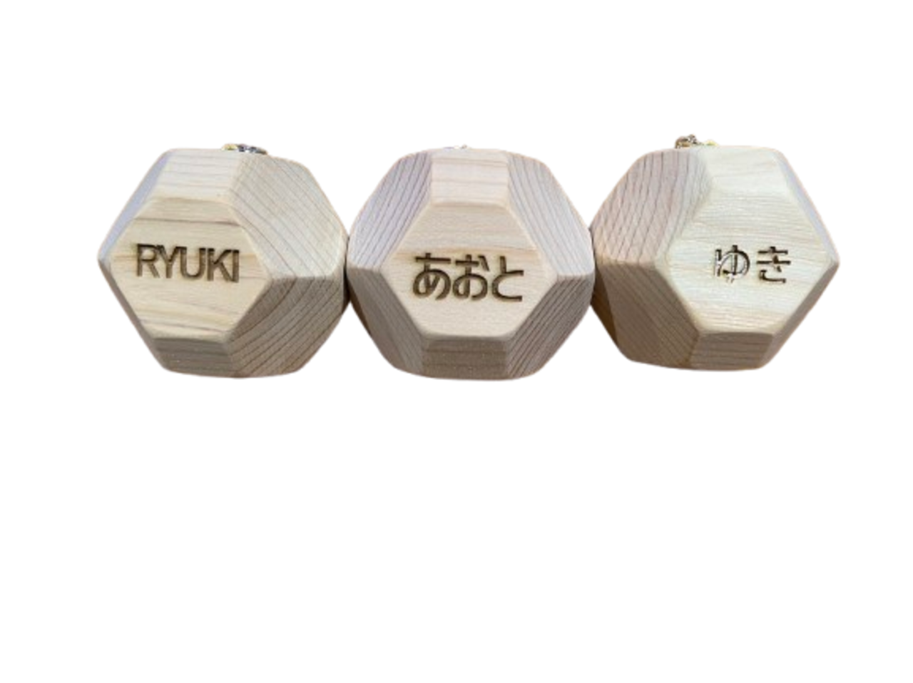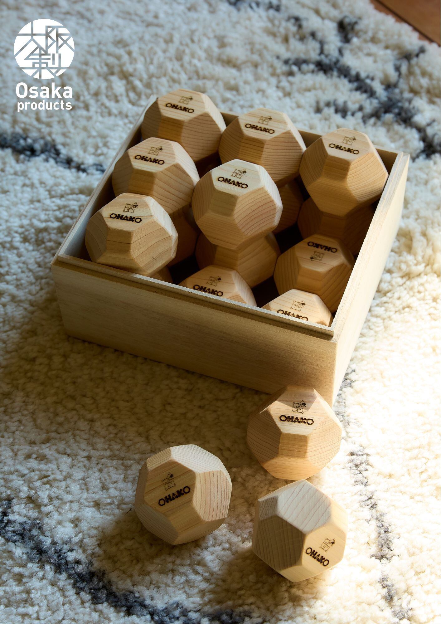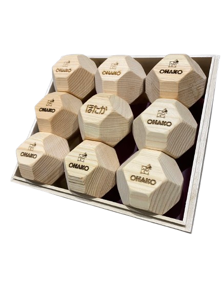 ひとつひとつの積み木に刻印を施した18個の多面体ヒノキ積み木。