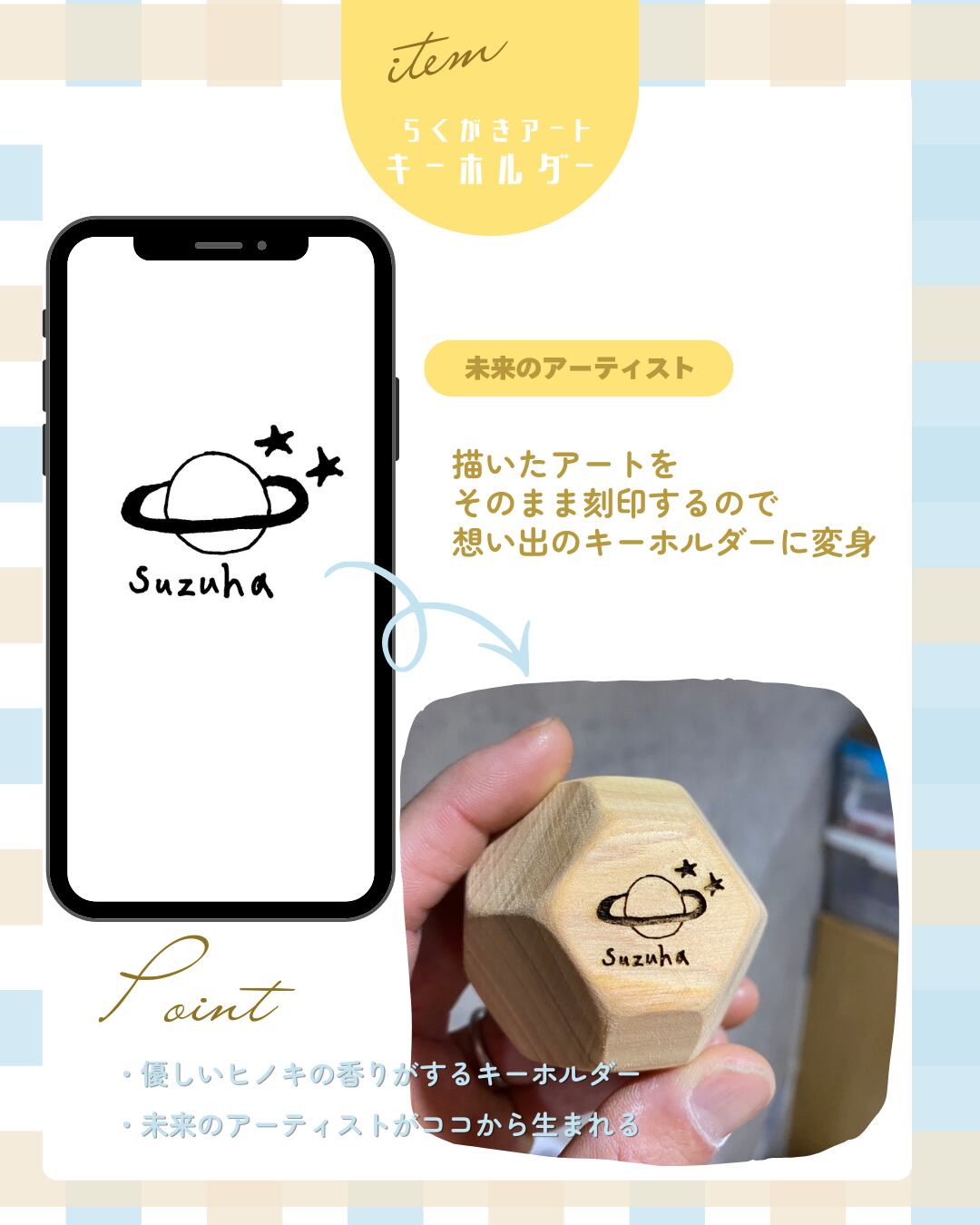 子どもが描いたイラストを、国産ヒノキの18面体キーホルダーの刻印♪