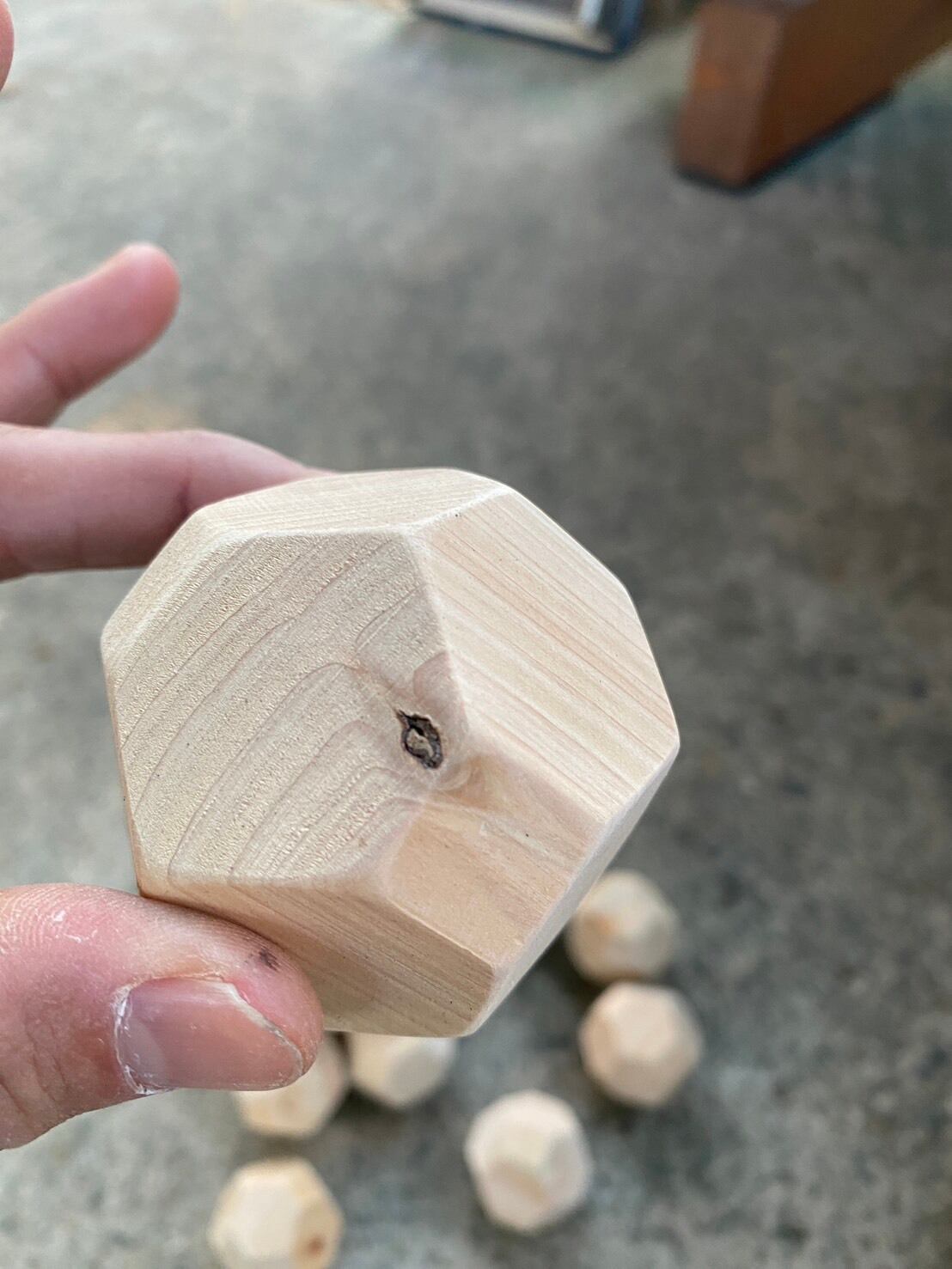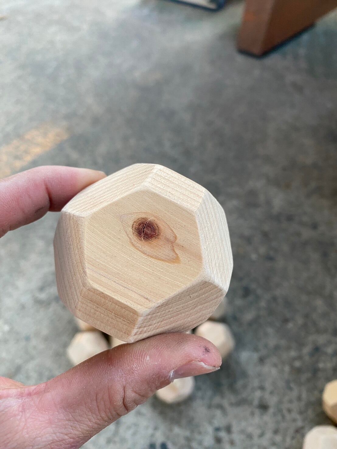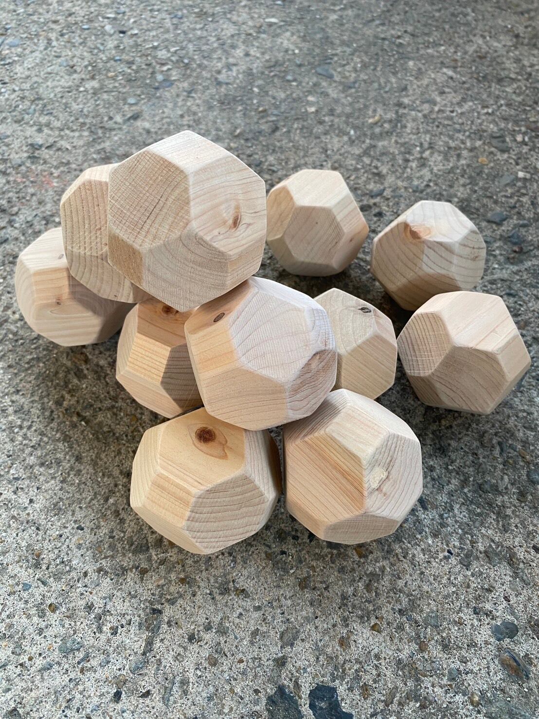 ひとつひとつの積み木に刻印を施した18個の多面体ヒノキ積み木。