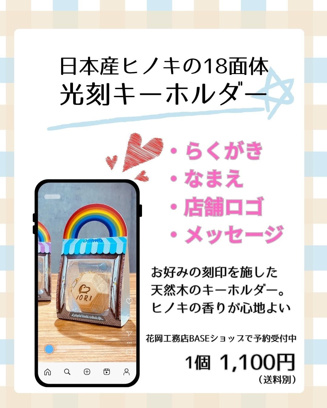 子どもが描いたイラストを、国産ヒノキの18面体キーホルダーの刻印♪